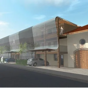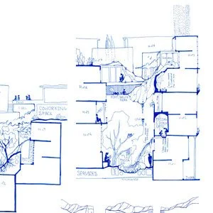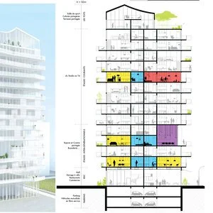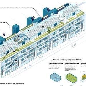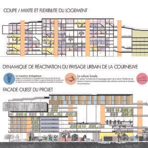 Le projet « La Recyclerie Courneuvienne » de Shama Boudhabay, se situe à la Cité des 4000 à la Courneuve, en banlieue parisienne. Il s’agit d’une proposition de réhabilitation de la barre Robespierre, un des grands ensembles les plus emblématique de France. La réhabilitation y est envisagée comme capacité transformatrice d’une qualité urbaine mais aussi sociale et culturelle. Il s’agit de promouvoir l’importance du vivre ensemble et du commun et de voir l’architecture comme un processus et une entité vivant capable d’évoluer avec les transformations de la population.
